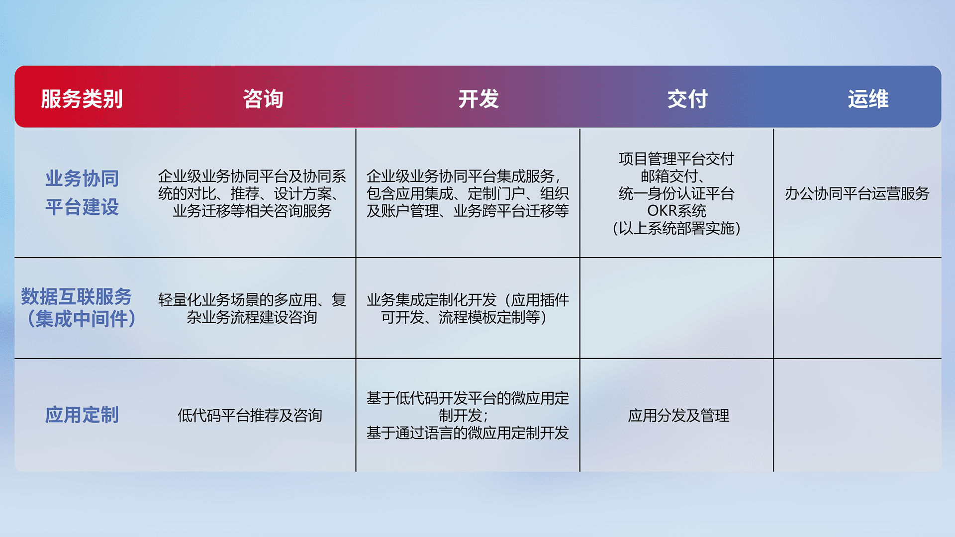 针对钉钉、、、、企微、、IDaas等平台级产品提供产品的规划、、、方案、、、交付、、、、定制化开发等服务,,实现如统一协同办公、、、、智能客户服务、、混合会议管理、、智能数据查询、、、、等业务场景,,,,实现数字化转型。。。